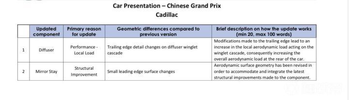 凯迪拉克,升级部件1:扩散器,升级主要原因:性能-局部负载,扩散器尖端小翼片后缘细节变化;升级部件2:后视镜固定装置,升级主要原因:结构改进,前缘表面的小改动。