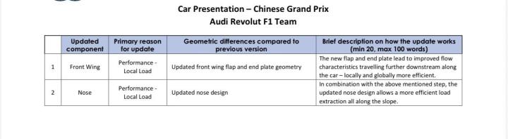 奥迪,升级部件1:前翼,升级主要原因:局部负载,前翼襟翼和端板的几何外形;升级部件2:鼻翼,升级主要原因:性能-局部负载,鼻翼设计更新。