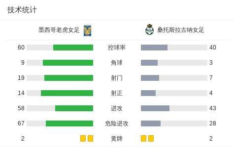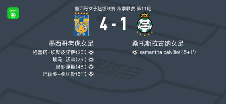 北京时间3月13日墨西哥女子超级联赛 秋季联赛 第11轮,墨西哥老虎女足主场对阵桑托斯拉古纳女足。墨西哥老虎女足格蕾塔-埃斯皮诺萨破门,埃马-沃森破门,奥多涅斯破门,玛丽亚-桑切斯破门。桑托斯拉古纳女足samantha calvillo破门。最终比分墨西哥老虎女足 4-1 拉古纳女足。