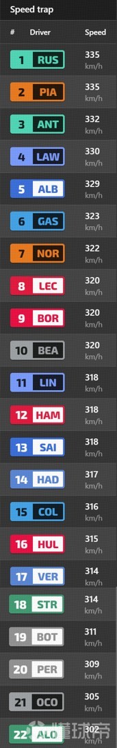 周五练习赛上,梅赛德斯包揽一二,迈凯伦位列三四,法拉利占据第五第六。维斯塔潘落后榜首的拉塞尔1.8秒。尾速上,两车也是差距悬殊。拉塞尔335km/h的尾速和皮亚斯特里一样,并列全场最快。维斯塔潘的尾速仅有314km/h,排名全场倒数第六。哈贾尔的尾速为317km/h,排名全场第十四。