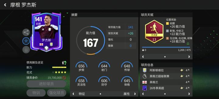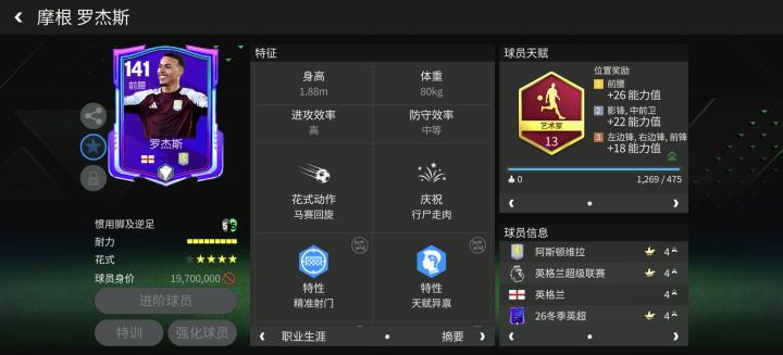 冬季英超罗杰斯能力值只有141,是一张适合新手玩家的进攻中场,配备艺术家天赋。花式方面,四星花式星级搭配马赛回旋,他具备稳定的持球进攻能力。
