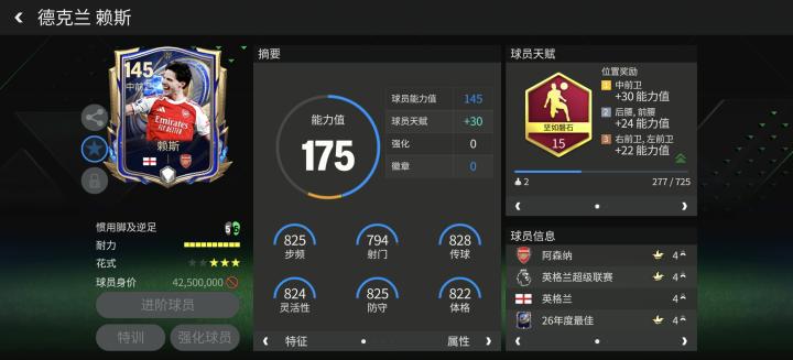 游戏中,26年度最佳活动中推出的赖斯司职中前卫,天赋配备了坚如磐石,对他的防守端表现提升显著,马赛回旋搭配三星花式星级也让他具备了一定的中场持球进攻能力。