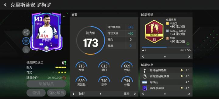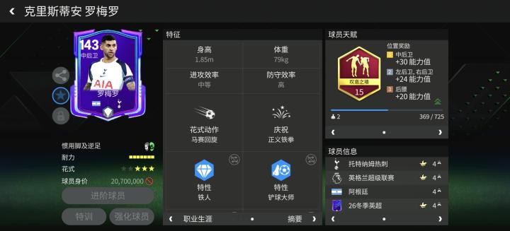 游戏中,冬季英超活动推出的罗梅罗能力值为143,司职中后卫的他攻守效率为中等+高,配备了叹息之墙天赋,大大增强了他的防守端稳定性。
