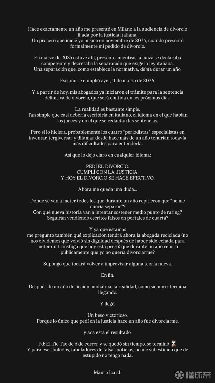 北京时间3月12日消息,伊卡尔迪在社交媒体上宣布,经过一年多分居,自己已经与旺达正式离婚。