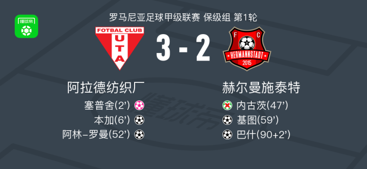 北京时间3月13日罗马尼亚足球甲级联赛 保级组 第1轮,阿拉德纺织厂主场对阵赫尔曼施泰特。阿拉德纺织厂本加破门,阿林-罗曼破门。赫尔曼施泰特基图破门,巴什破门,塞普舍自摆乌龙。最终比分阿拉德纺织厂 3-2 赫尔曼施泰特。