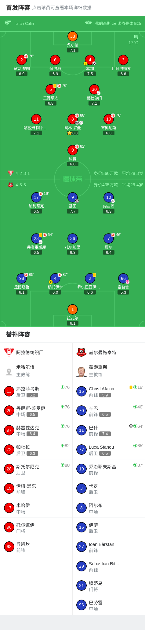 阿拉德纺织厂3-2赫尔曼施泰特,阿林-罗曼传射,本加破门