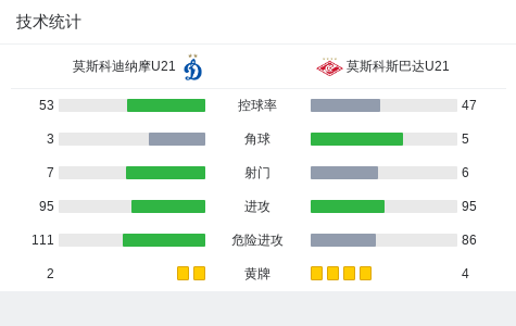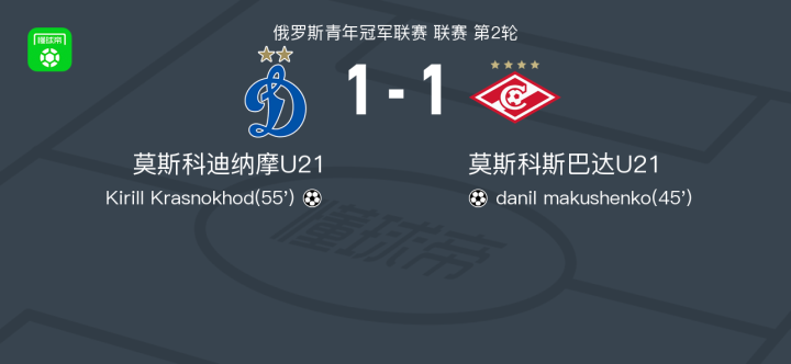 北京时间3月14日俄罗斯青年冠军联赛 联赛 第2轮,莫斯科迪纳摩U21对阵莫斯科斯巴达U21。莫斯科迪纳摩U21Kirill Krasnokhod破门。莫斯科斯巴达U21danil makushenko破门。最终比分莫斯科迪纳摩U21 1-1 莫斯科斯巴达U21。