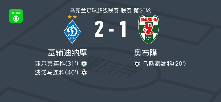 北京时间3月14日乌克兰足球超级联赛 联赛 第20轮,基辅迪纳摩主场对阵奥布隆。基辅迪纳摩亚尔莫连科破门,波诺马连科破门。奥布隆乌斯泰缅科破门。最终比分基辅迪纳摩 2-1 基辅奥布隆。