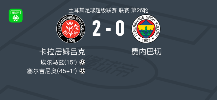 卡拉居姆吕克2-0费内巴切,埃尔马兹破门,塞尔吉尼奥锦上添花