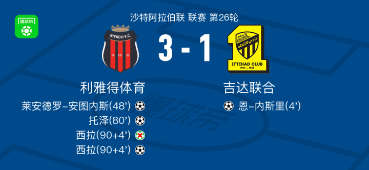 北京时间3月14日沙特阿拉伯联 联赛 第26轮,利雅得体育主场对阵吉达联合。利雅得体育莱安德罗-安图内斯破门,托泽破门,西拉破门。吉达联合恩-内斯里破门。最终比分利雅得体育 3-1 吉达联合。