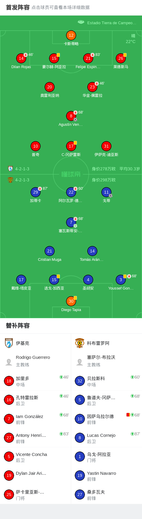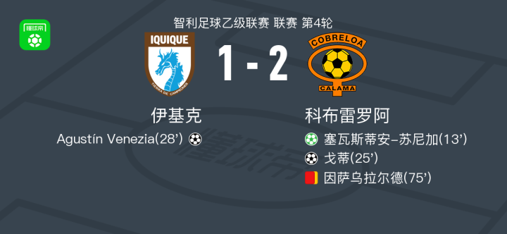 北京时间3月14日智利足球乙级联赛 联赛 第4轮,伊基克主场对阵科布雷罗阿。伊基克Agustín Venezia破门。科布雷罗阿塞瓦斯蒂安-苏尼加破门,戈蒂破门。最终比分伊基克 1-2 科布雷罗阿。