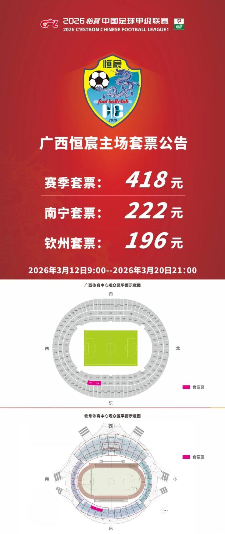 日前,中甲升班马广西恒宸公布了新赛季的票务方案,该球队新赛季将在南宁和钦州“双城作战”,也提供了南宁套票、钦州套票和赛季套票三种模式供球迷选择。