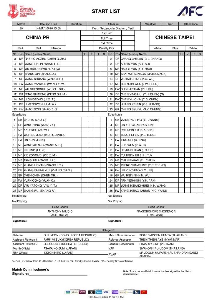 北京时间3月14日13:00,女足亚洲杯1/4决赛,中国女足对阵中国台北女足。赛前比赛名单公布,陈晨因膝伤本场无缘首发。