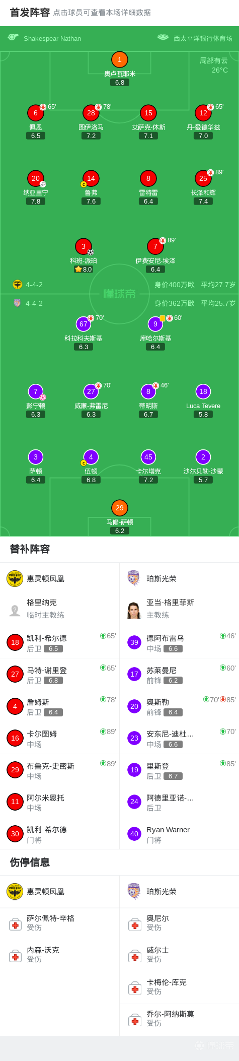 惠灵顿凤凰2-0珀斯光荣,派珀破僵,彭宁顿乌龙