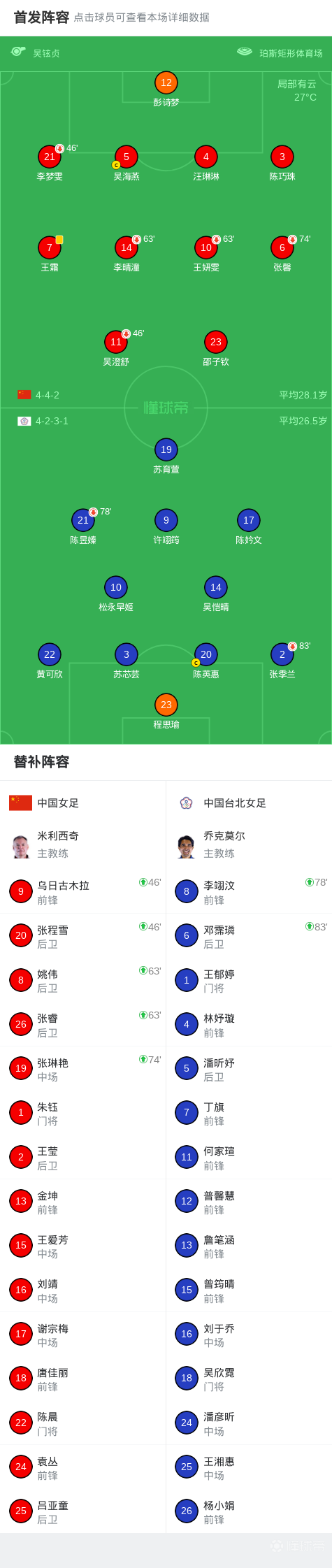 第62分钟,姚伟、张睿登场,王妍雯、李晴潼被换下