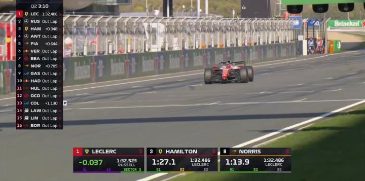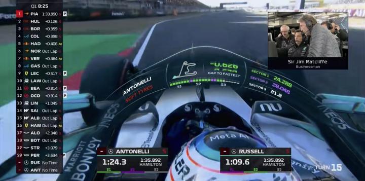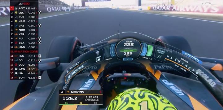 第一个飞驰圈结束过后,安东内利排名第一,两台迈凯伦排名二三,两台法拉利排名四五,两台红牛排名六七,拉塞尔只剩最后一圈的机会;