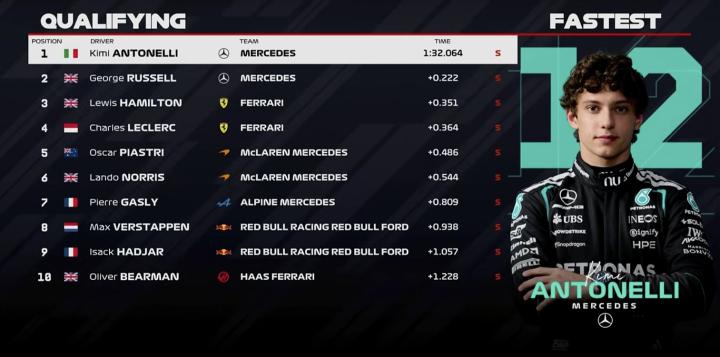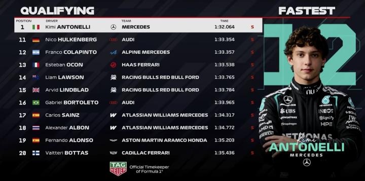 F1中国站排位赛:安东内利历史最年轻杆位,拉塞尔第二,法拉利三四