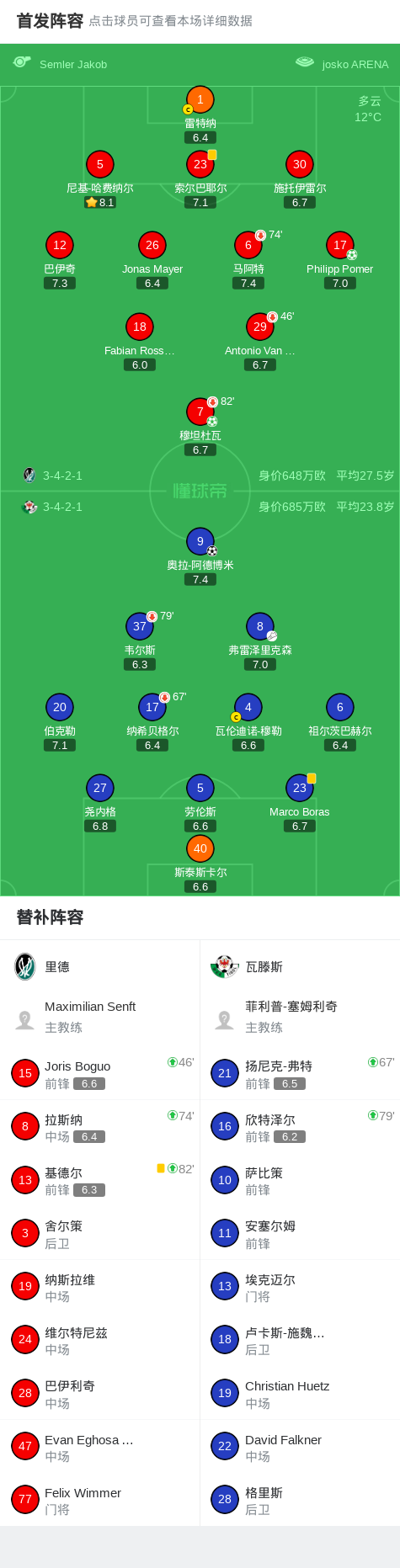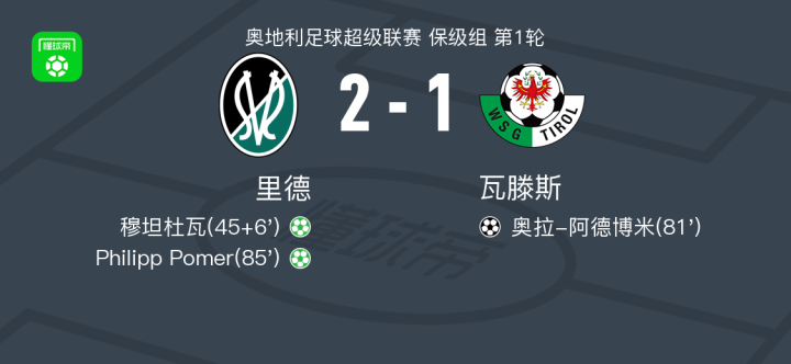 北京时间3月15日奥地利足球超级联赛 保级组 第1轮,里德主场对阵瓦滕斯。里德穆坦杜瓦破门,Philipp Pomer破门。瓦滕斯奥拉-阿德博米破门。最终比分里德 2-1 瓦滕斯。