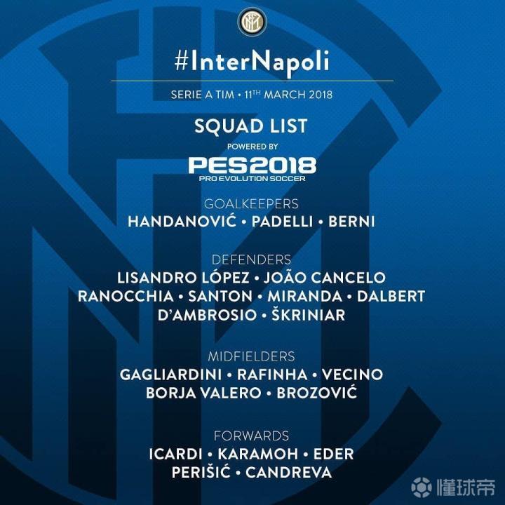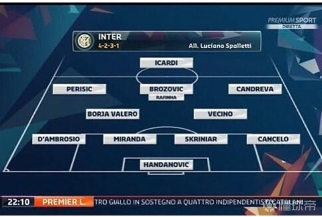【预测首发】4-2-3-1:汉达诺维奇、丹布罗西奥、米兰达、什克里尼亚尔、坎塞洛、巴莱罗、贝西诺、布罗佐维奇、佩里西奇、坎德雷瓦、伊卡尔迪