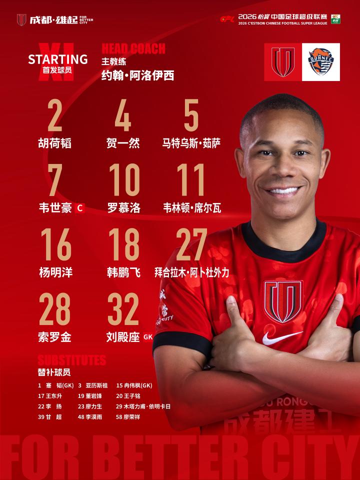 中超联赛 成都蓉城vs青岛海牛 比赛首发名单出炉!成都,雄起!