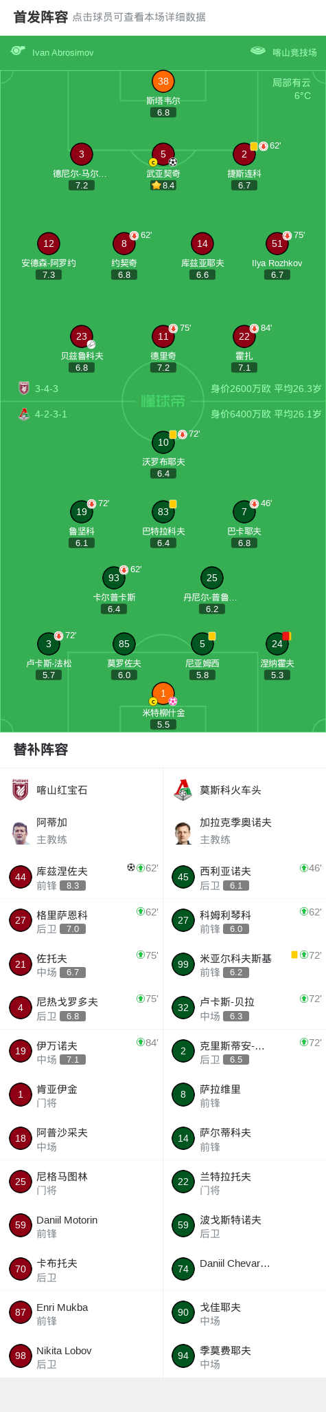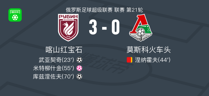 北京时间3月16日俄罗斯足球超级联赛 联赛 第21轮,喀山红宝石主场对阵莫斯科火车头。喀山红宝石武亚契奇破门,库兹涅佐夫破门。莫斯科火车头米特柳什金自摆乌龙。最终比分喀山红宝石 3-0 莫斯科火车头。