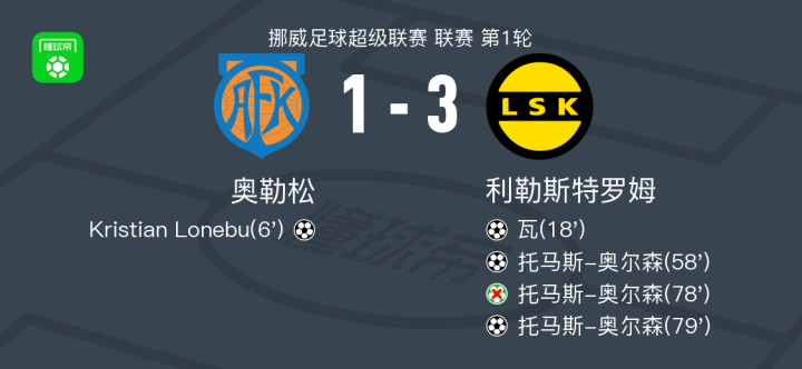 北京时间3月16日挪威足球超级联赛 联赛 第1轮,奥勒松主场对阵利勒斯特罗姆。奥勒松Kristian Lonebu破门。利勒斯特罗姆瓦破门,托马斯-奥尔森梅开二度。最终比分奥勒松 1-3 利勒斯特罗姆。