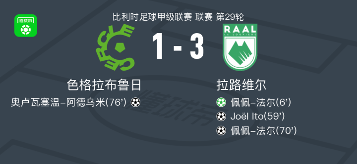 北京时间3月16日比利时足球甲级联赛 联赛 第29轮,色格拉布鲁日主场对阵拉路维尔。色格拉布鲁日奥卢瓦塞温-阿德乌米破门。拉路维尔佩佩-法尔梅开二度,Joël Ito破门。最终比分色格拉布鲁日 1-3 拉路维尔。