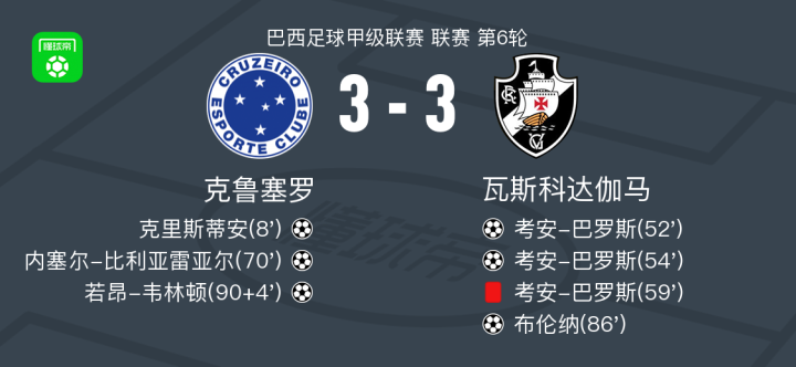 北京时间3月16日巴西足球甲级联赛 联赛 第6轮,克鲁塞罗主场对阵瓦斯科达伽马。克鲁塞罗克里斯蒂安破门,内塞尔-比利亚雷亚尔破门,若昂-韦林顿破门。瓦斯科达伽马考安-巴罗斯梅开二度,布伦纳破门。最终比分克鲁塞罗 3-3 瓦斯科达伽马。
