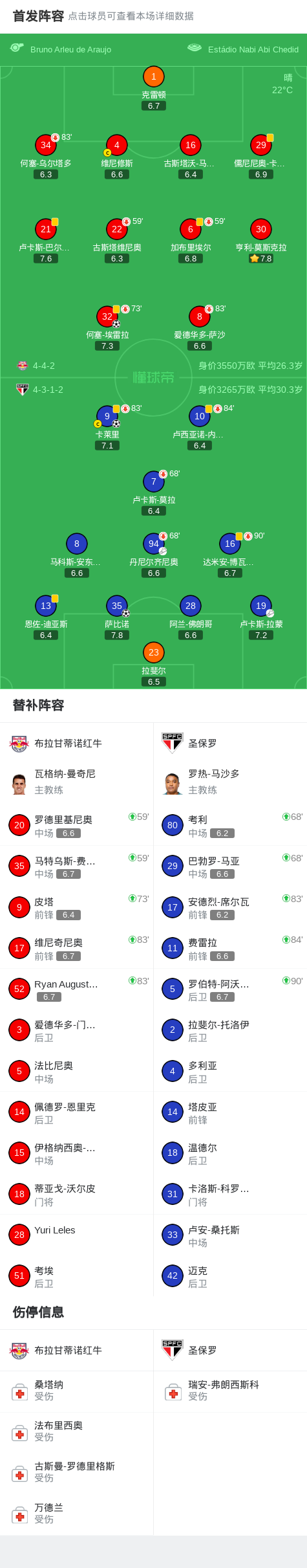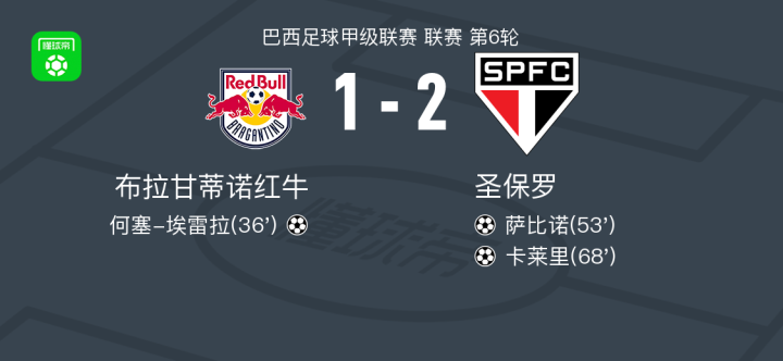 北京时间3月16日巴西足球甲级联赛 联赛 第6轮,布拉甘蒂诺红牛主场对阵圣保罗。布拉甘蒂诺红牛何塞-埃雷拉破门。圣保罗萨比诺破门,卡莱里破门。最终比分布拉甘蒂诺 1-2 圣保罗。