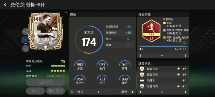 巅峰荣耀球员普斯卡什配备了艺术家天赋。花式方面,普斯卡什配备高级油炸丸子花式,花式星级达到五星,这样的配置让他持球进攻更具威胁。