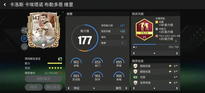 邓加推出的巅峰荣耀球员卡配备叹息之墙天赋。花式方面,马赛回旋让他的中场摆脱能力值得肯定,高达10格的耐力值也让他能长时间保持稳定发挥。