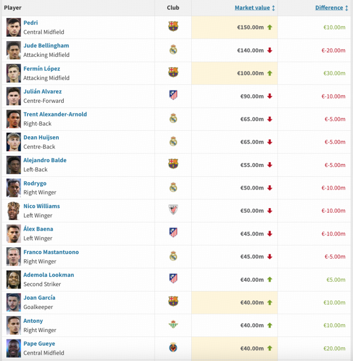 本期身价上涨最多的是费尔明上涨3000万欧,下降最多的是贝林厄姆下降2000万欧。