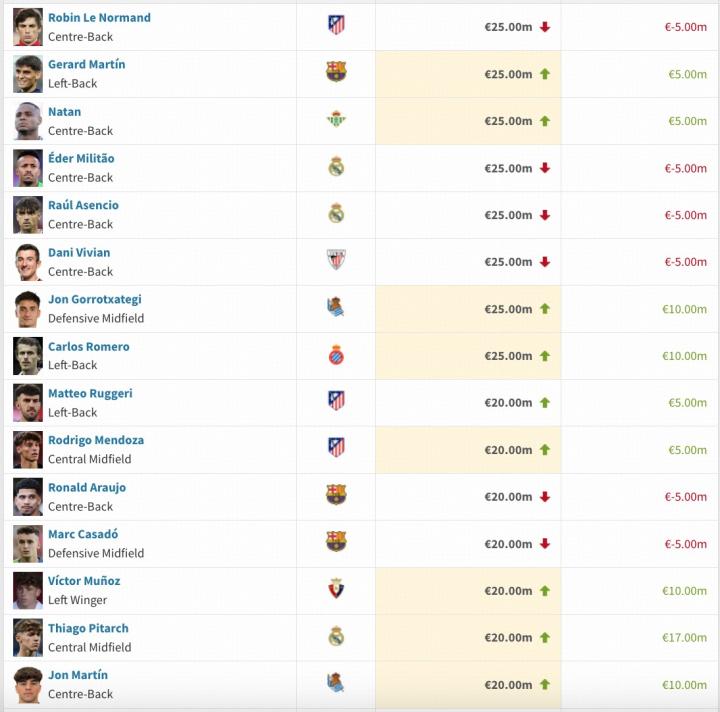 西甲球员本期身价变动详情