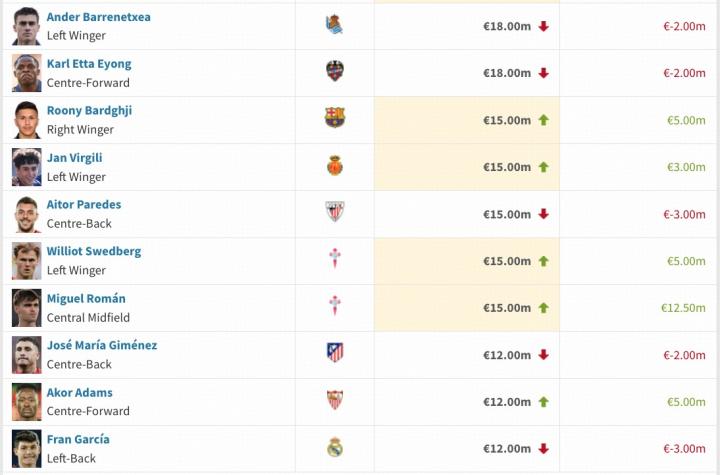 西甲本期身价上涨达1000万欧的球员