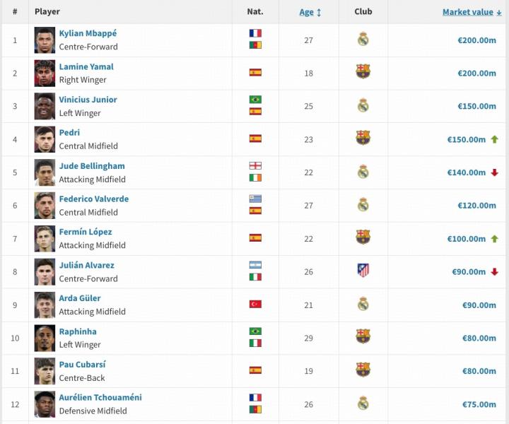 佩德里上涨1000万欧,身价1.5亿欧。贝林厄姆下降2000万欧,身价1.4亿欧。姆巴佩与亚马尔身价没有变动,依然是2亿欧,并列西甲榜首,维尼修斯身价1.5亿欧并列第三。