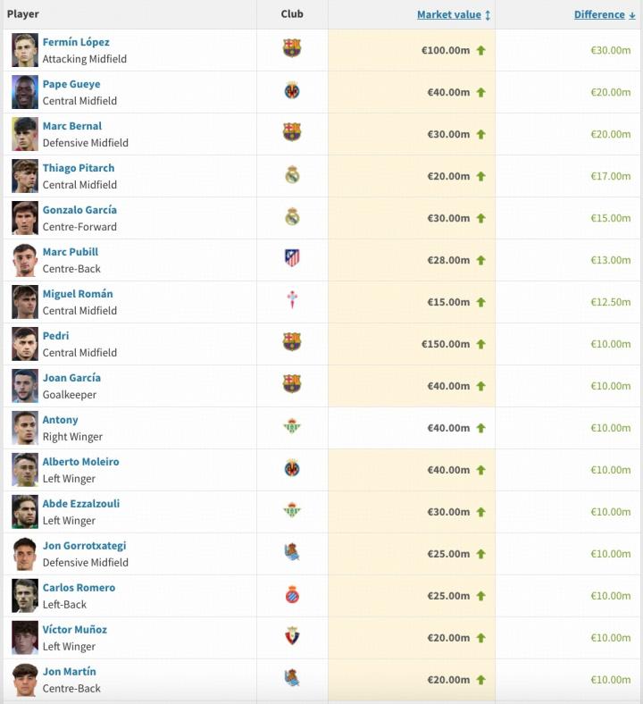 巴萨四名球员身价上涨至少1000万欧,其中费尔明上涨3000万欧,贝尔纳尔2000万欧,佩德里1000万欧,霍安-加西亚1000万欧。黄潜中场帕普-盖伊是身价上涨第二多的球员,达2000万欧。