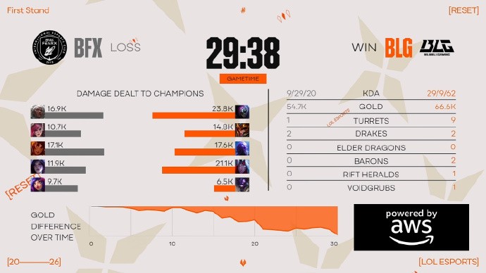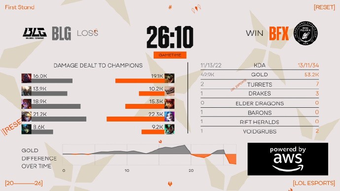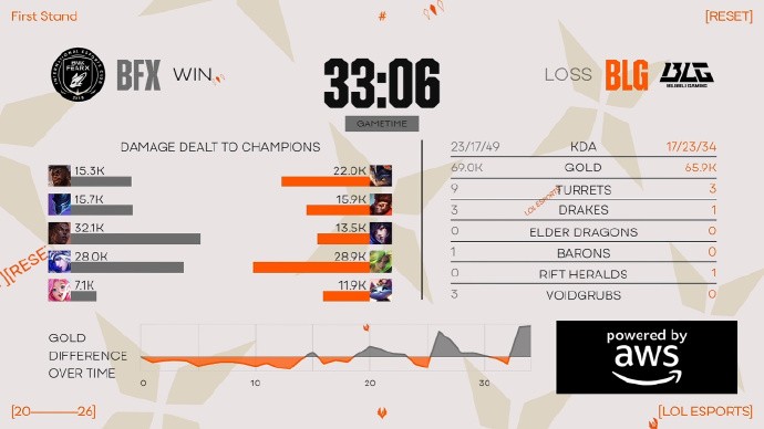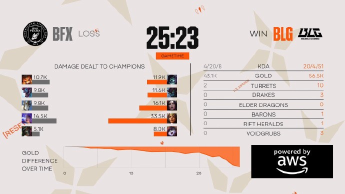 刚开局Knight就在中路单杀了Vicla,上路BLG两人也抓死Clear,6分钟Knight直接越二塔再次单杀,Bin武器也成功单杀狼母,虽然BFX置换到一些人头,但整体BLG还是拿到2k领先。15分钟的团战BLG打出团灭,自此局势一发不可收拾,BLG拿到第二条大龙后一波结束比赛!