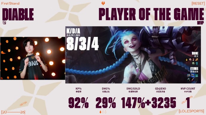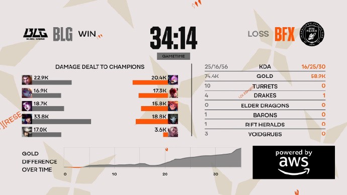 开局On青钢影抽象操作送出一血,但波比对盲僧和洛的克制作用体现出来,BLG连续几波碰撞都取得了上风,第16分钟,BLG上野率先掉点,但BLG凭借更多的C位打出3换3,但转头BLG又送出两颗人头。关键团战中Viper打出爆炸输出,BLG打出3换5团灭BFX。BLG选择稳稳拿下龙魂和大龙后一波结束比赛!