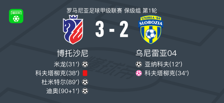 北京时间3月16日罗马尼亚足球甲级联赛 保级组 第1轮,博托沙尼主场对阵乌尼雷亚04。博托沙尼米龙破门,杜米特尔破门,迪奥破门,科夫塔柳克自摆乌龙。乌尼雷亚04亚纳科夫破门。最终比分博托沙尼 3-2 乌尼雷亚04。