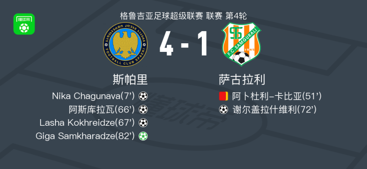 北京时间3月17日格鲁吉亚足球超级联赛 联赛 第4轮,斯帕里主场对阵萨古拉利。斯帕里Nika Chagunava破门,阿斯库拉瓦破门,Lasha Kokhreidze破门,Giga Samkharadze破门。萨古拉利谢尔盖拉什维利破门。最终比分斯帕里 4-1 萨古拉利。
