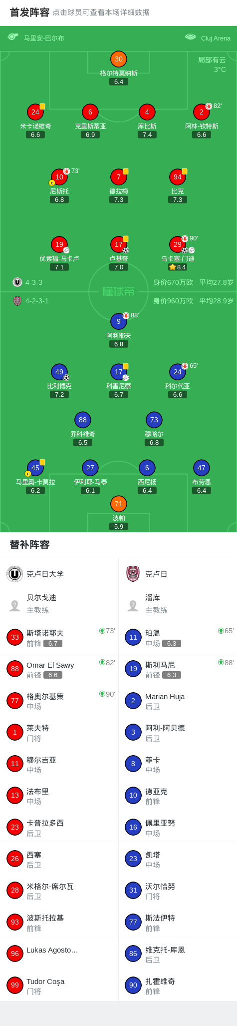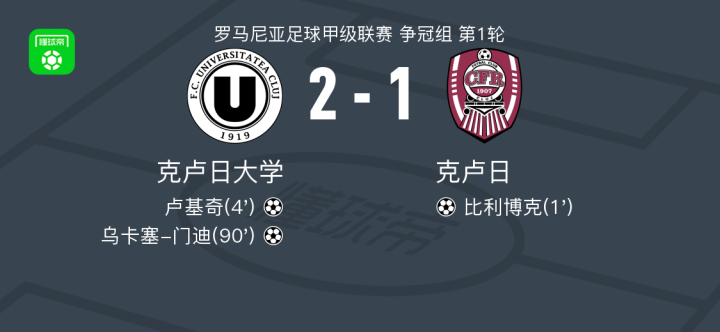 北京时间3月17日罗马尼亚足球甲级联赛 争冠组 第1轮,克卢日大学主场对阵克卢日。克卢日大学卢基奇破门,乌卡塞-门迪破门。克卢日比利博克破门。最终比分克卢日大学 2-1 克卢日。