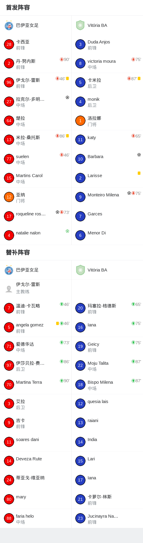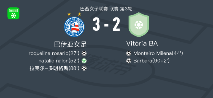 北京时间3月17日巴西女子联赛 联赛 第3轮,巴伊亚女足主场对阵Vitória BA。巴伊亚女足roqueline rosario破门,拉克尔-多明格斯破门,natalie nalon破门。Vitória BAMonteiro Milena破门,Barbara破门。最终比分巴伊亚女足 3-2 Vitória BA。