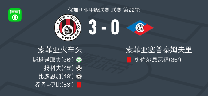 北京时间3月18日保加利亚甲级联赛 联赛 第22轮,索菲亚火车头主场对阵索菲亚塞普泰姆夫里。索菲亚火车头斯塔诺耶夫破门,扬科夫破门,比多恩加破门。最终比分索菲亚火车头 3-0 索菲亚塞普泰姆夫里。