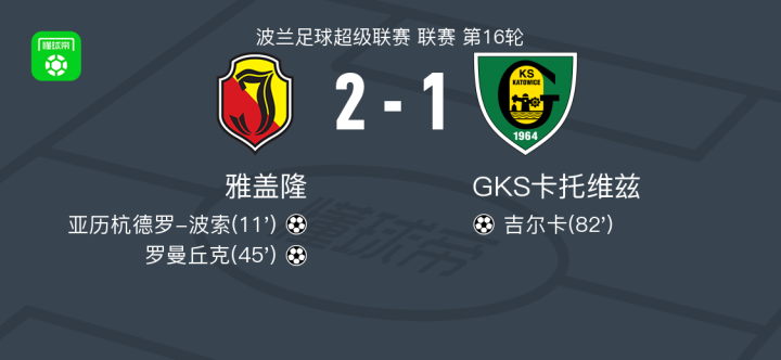 雅盖隆2-1GKS卡托维兹,罗曼丘克破门,亚历杭德罗-波索建功