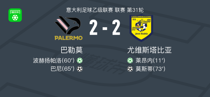 北京时间3月18日意大利足球乙级联赛 联赛 第31轮,巴勒莫主场对阵尤维斯塔比亚。巴勒莫波赫扬帕洛破门,巴尼破门。尤维斯塔比亚莱昂内破门,莫斯蒂破门。最终比分巴勒莫 2-2 尤维斯塔比亚。
