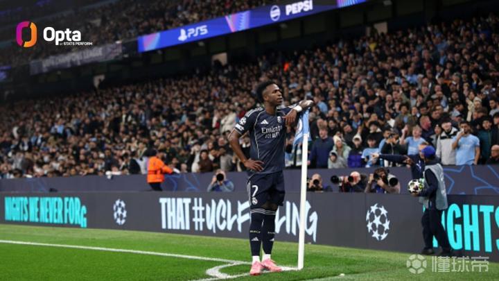 此役客场对阵曼城,维尼修斯在上半场主罚点球破门。