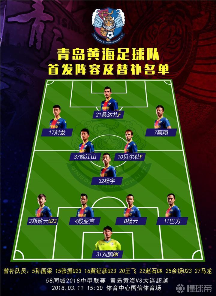 本场首发阵容方面,青岛黄海队本赛季新加入的新援郑致云、殷亚吉、杨宇、桑达扎首发出场。