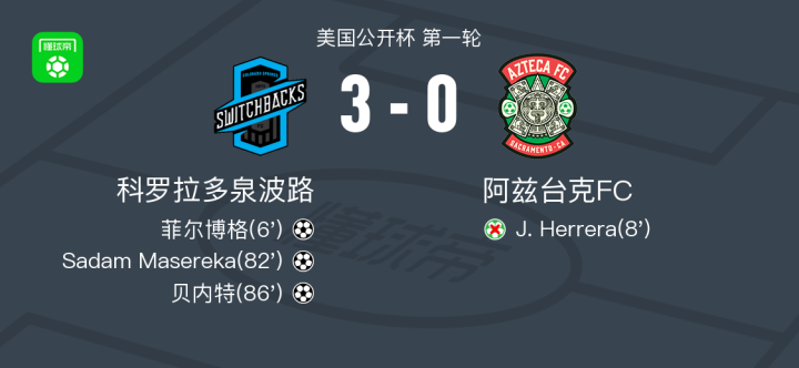 北京时间3月18日美国公开杯 第一轮,科罗拉多泉波路对阵阿兹台克FC。科罗拉多泉波路菲尔博格破门,Sadam Masereka破门,贝内特破门。最终比分科罗拉多泉波路 3-0 阿兹台克FC。