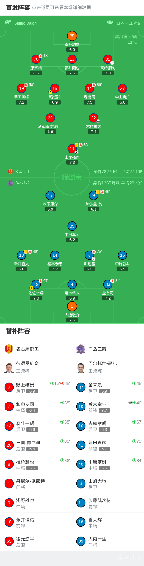 北京时间3月18日日本职业联赛J1西区第7轮,名古屋鲸鱼主场对阵广岛三箭。名古屋鲸鱼山岸祐也、木村勇大分别破门。广岛三箭铃木章斗建功。最终比分名古屋鲸鱼2-1广岛三箭。