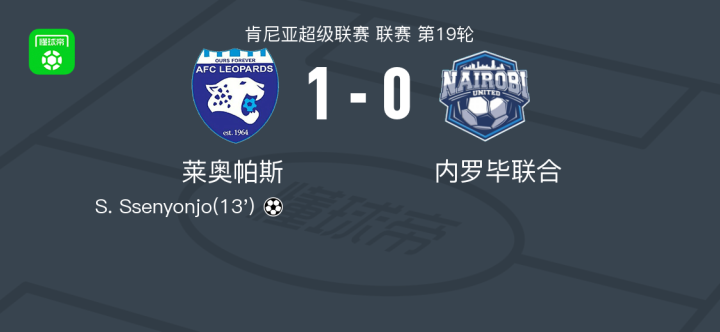 莱奥帕斯1-0内罗毕联合,S. Ssenyonjo一锤定音战报bot @懂球帝03-18 21:57北京时间3月18日肯尼亚超级联赛 联赛 第19轮,莱奥帕斯主场对阵内罗毕联合。莱奥帕斯S. Ssenyonjo破门。最终比分莱奥帕斯 1-0 内罗毕联合。点击查看本场比赛详细数据>>精彩瞬间第13分钟,莱奥帕斯球员S. Ssenyonjo打入一球。展开更多